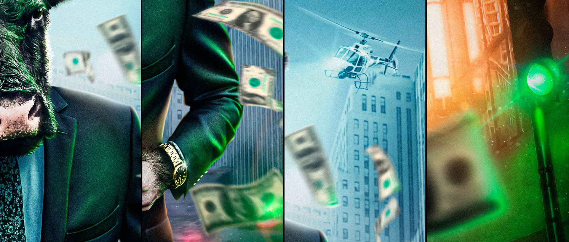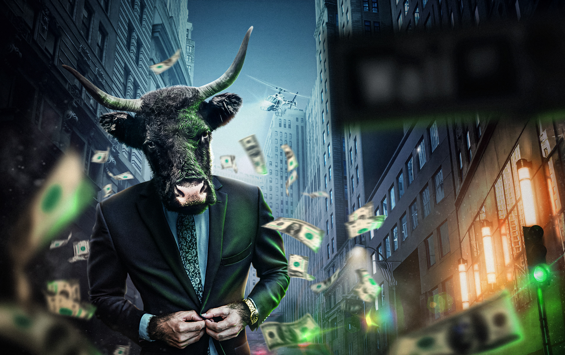 This is a conceptual project by Creative Retouching. An unusual scene where an anthropomorphized figure of the Bull walks through Wall Street, the historic heart of the current Financial District of New York, where the Bull is considered an important symbol (a metaphor for the financial market that indicates the rise of stock markets) and, in a way, is always chased.